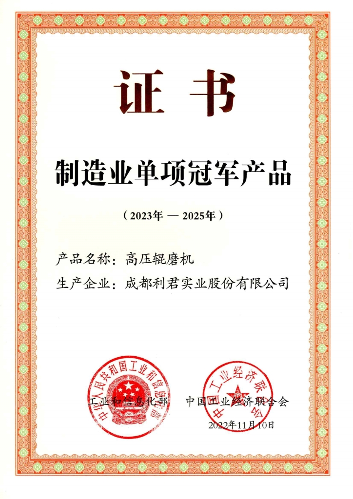 批、第四批制造业单项冠军企业(产品)名单的通知》,成都yth2206游艇会实业股份有限公司(以下简称“公司”)产品“高压辊磨机”入选为第七批制造业单项冠军产品